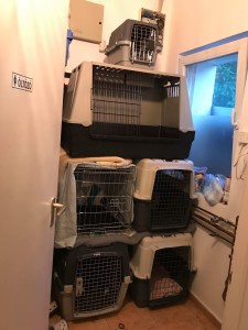 A kutya mindennek nekimegy a tölcsérrel a fején, a macskát meg be kellett zárnom a katéter miatt, így viszont folyamatosan nyávog. Haza akarok menni! Ja, várj… otthon vagyok.