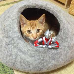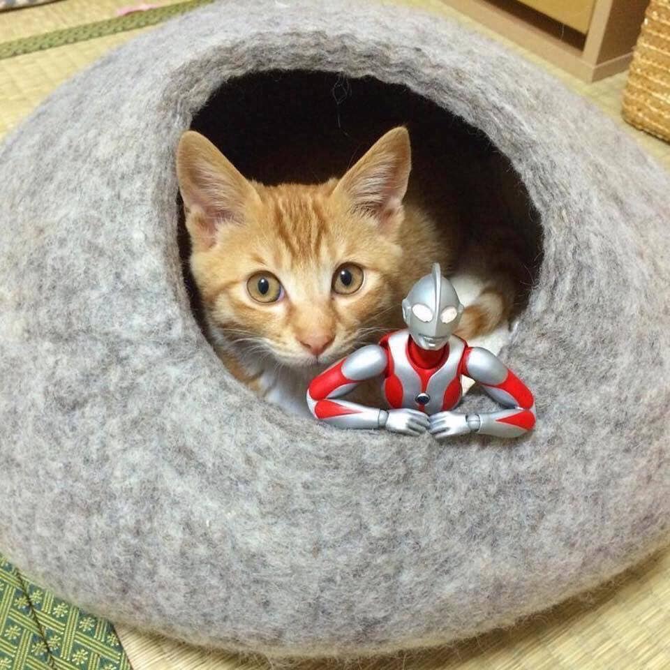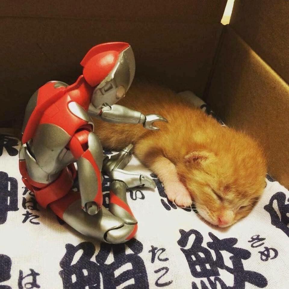 Ultraman a képek tanúsága szerint nagyon komolyan vette a küldetését, éjjel-nappal felügyelte a rá bízott cicát.