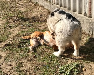 Az első perctől azon dolgoztunk, hogy keresse a tekintetemet, ha valamit szeretne. Ez annyira jól sikerült, hogy egy lépést sem tehetek anélkül, hogy ne bámulna az arcomba. Mindez világítóan kék szemekkel súlyosbítva egy félhomályos udvaron képes pillanatnyi szívmegállást okozni. Aztán persze megszokja az ember. Mint ahogy azt is megszoktam, hogy a kutya nem halott, csak a lábait szanaszét dobva alszik a hátán a legnagyobb hangzavar közepén, mert semmit sem hall abból, ami körülötte zajlik.