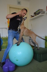 A kutyák hetente egyszer vagy kétszer jönnek hozzánk. Alkalmanént egy 45 perces-egy órás intenzív foglalkozáson vesznek részt, és összeállítunk nekik egy személyre szabot edzéstervet, ami napi néhány perces otthoni gyakorlást tartalmaz a gazdával. Mi speciális eszközöket használunk, de egy kis kreativitással a napi pár perces gyakorlás idejére ezek ideiglenesen helyettesíthetőek olyan használati tárgyakkal, amelyek bárkinél megtalálhatóak a háztartásban. Egy kis kreativitással egy díszpárna, egy felfújható gumimatrac, egy sámli vagy egy leselejtezett fiók könnyedén fitness-segédeszközzé alakítható – persze szakszerű útmutatás alapján, az edzéstervet követve. Aztán, ha valaki évekig napi szinten gyakorol, akkor érdemes befektetni egy-két jobb minőségű eszközbe otthonra is. Ebben is szívesen segítünk, hogy kinek mit éri meg beszerezni.”